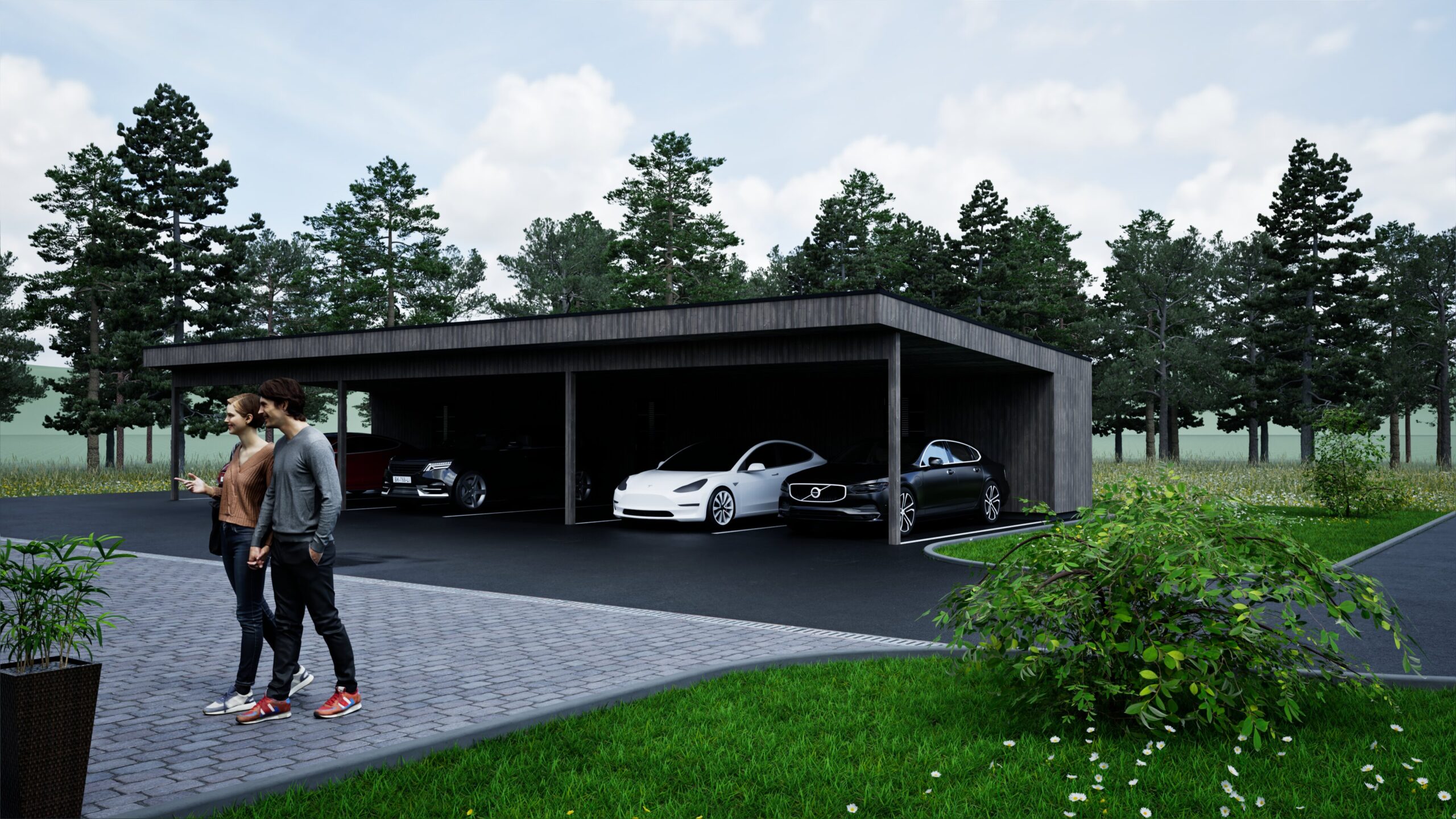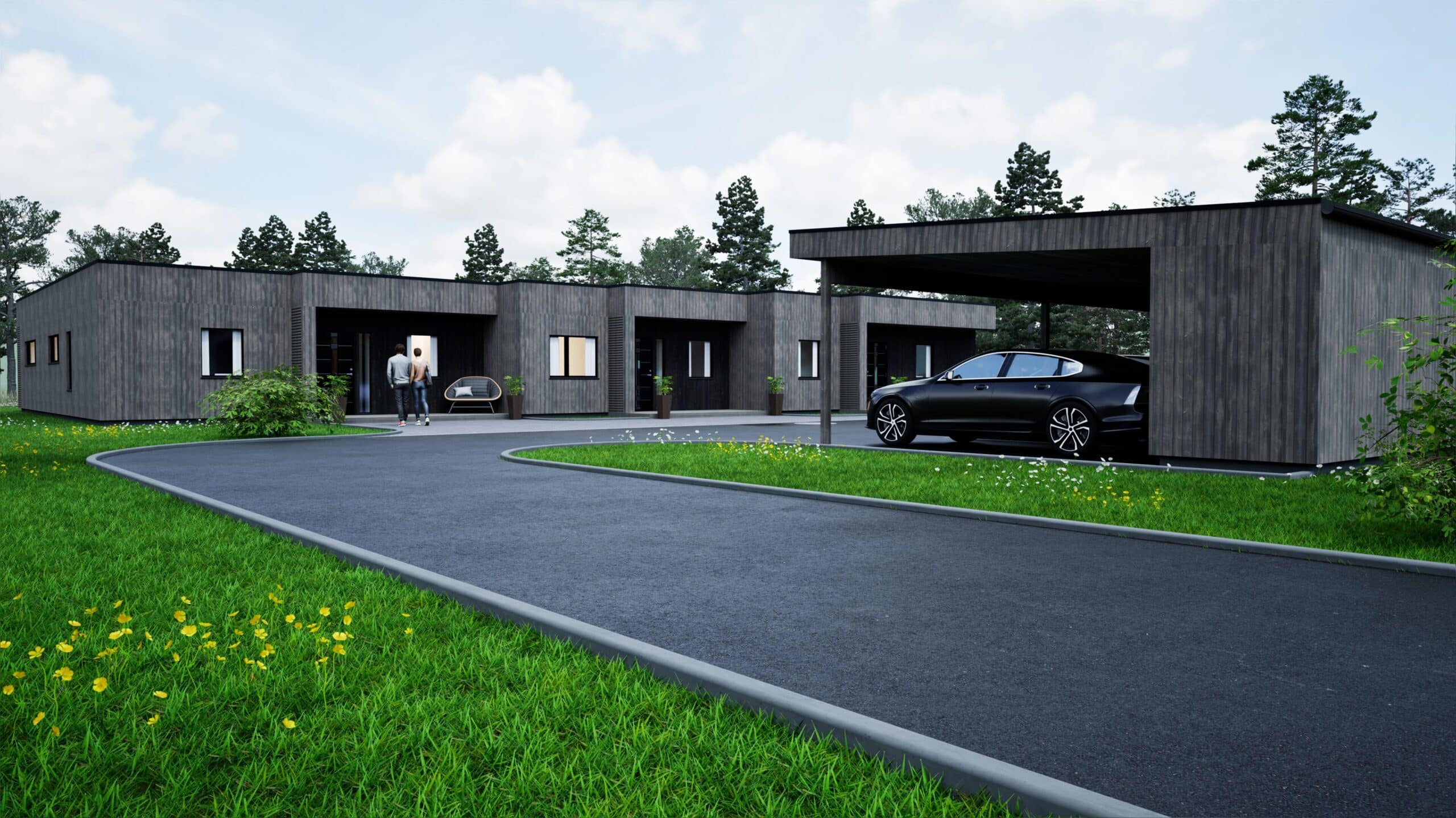 • Tre eneboliger i rekke med tilhørende carporter og sportsboder